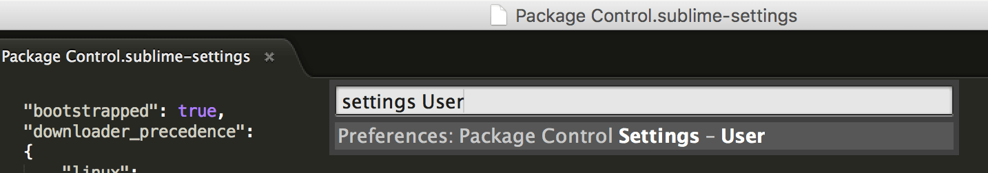 打开 Package Control 个人设置文件,Mac 下按下 commond+shift+P,在弹出框内输入 setting User 回车。