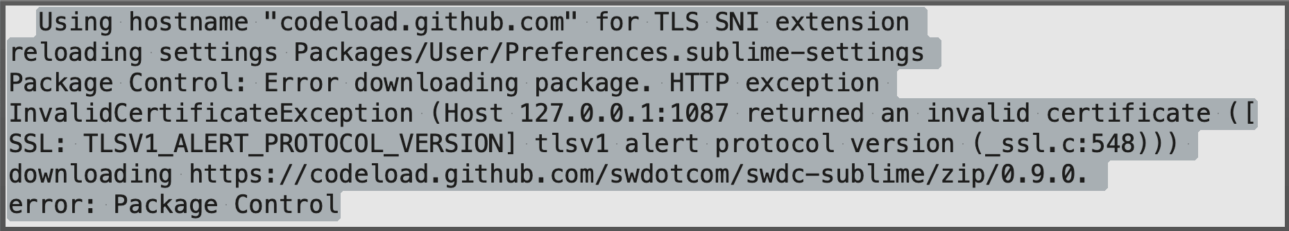 HTTP exception InvalidCertificateException (Host 127.0.0.1:1087 returned an invalid certificate ([SSL: TLSV1_ALERT_PROTOCOL_VERSION] tlsv1 alert protocol version (_ssl.c:548))) downloading https://codeload.github.com/swdotcom/swdc-sublime/zip/0.9.0.