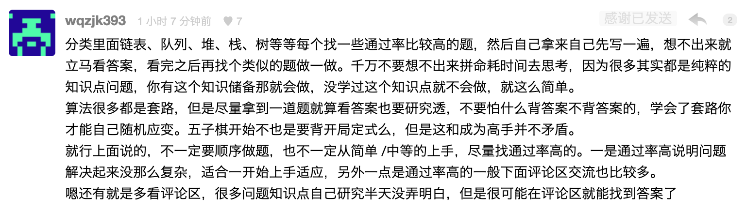 分类里面链表、队列、堆、栈、树等等每个找一些通过率比较高的题,然后自己拿来自己先写一遍,想不出来就立马看答案,看完之后再找个类似的题做一做。千万不要想不出来拼命耗时间去思考,因为很多其实都是纯粹的知识点问题,你有这个知识储备那就会做,没学过这个知识点就不会做,就这么简单。 算法很多都是套路,但是尽量拿到一道题就算看答案也要研究透,不要怕什么背答案不背答案的,学会了套路你才能自己随机应变。五子棋开始不也是要背开局定式么,但是这和成为高手并不矛盾。 就行上面说的,不一定要顺序做题,也不一定从简单 /中等的上手,尽量找通过率高的。一是通过率高说明问题解决起来没那么复杂,适合一开始上手适应,另外一点是通过率高的一般下面评论区交流也比较多。嗯还有就是多看评论区,很多问题知识点自己研究半天没弄明白,但是很可能在评论区就能找到答案。